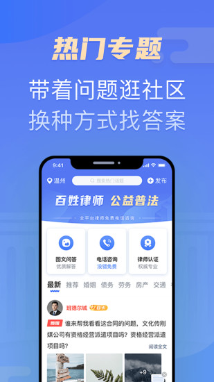 【社區(qū)】了解最新的法律咨詢(xún),可以隨時(shí)隨地發(fā)布碰到的法律問(wèn)題,海量專(zhuān)業(yè)律師在線(xiàn)為您解答。也可以發(fā)布生活動(dòng)態(tài),與其他用戶(hù)一起分享您的喜和悲。