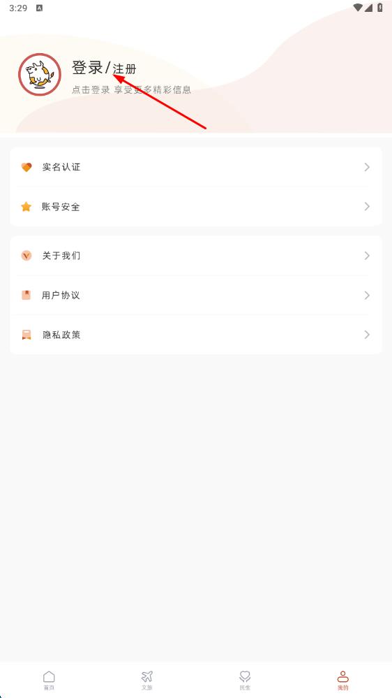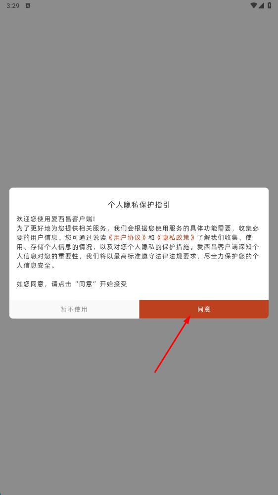 1、打開愛西昌APP,閱讀個人隱私保護指引后點擊“同意”,進入“我的”頁面,點擊上方“登錄/注冊”按鈕。