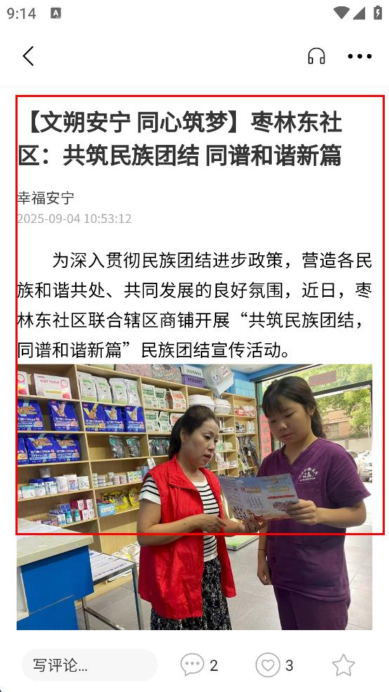 4、進(jìn)入文章頁(yè)面后,即可查看棗林東社區(qū)開(kāi)展民族團(tuán)結(jié)宣傳活動(dòng)的詳細(xì)內(nèi)容。