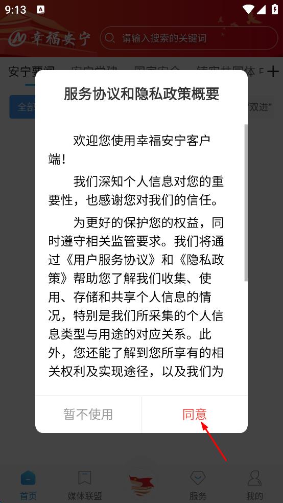 1、打開(kāi)幸福安寧APP,在彈出的服務(wù)協(xié)議和隱私政策概要提示框中,點(diǎn)擊“同意”按鈕。