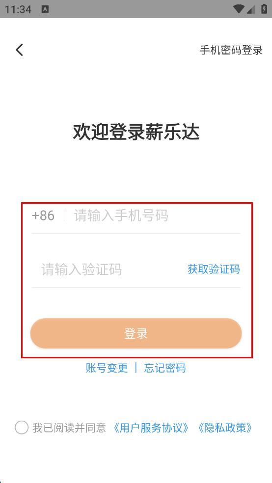 4、在手機(jī)密碼登錄界面,依次輸入手機(jī)號(hào)碼、獲取并輸入驗(yàn)證碼,確認(rèn)無(wú)誤后點(diǎn)擊登錄按鈕,即可完成薪樂(lè)達(dá)APP的登錄。