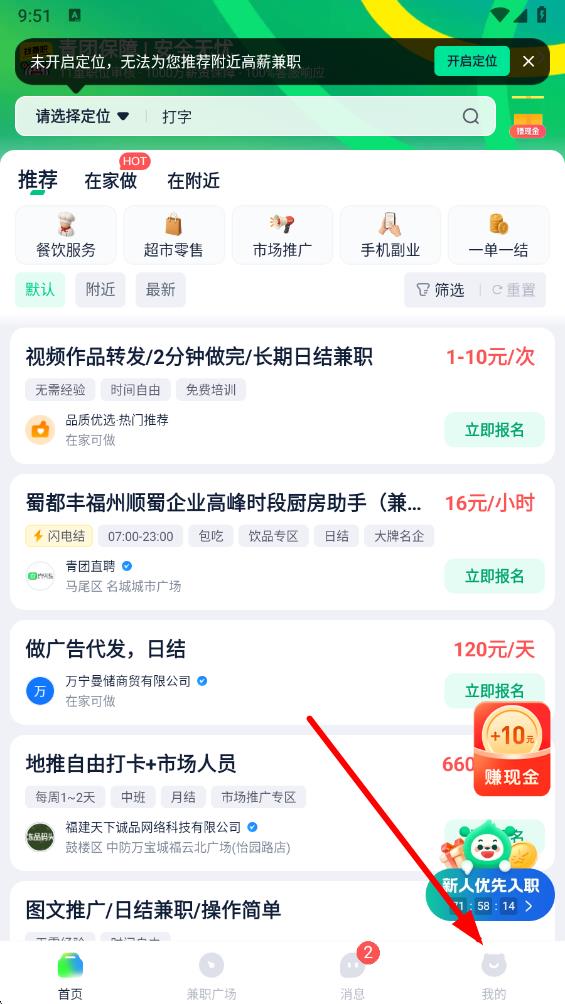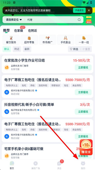 1、打開青團(tuán)社兼職APP進(jìn)入首頁(yè),點(diǎn)擊首頁(yè)底部右下角我的按鈕。
