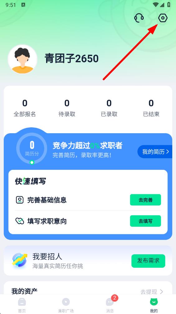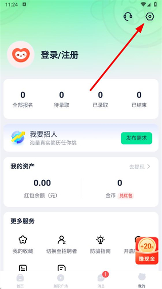 1、在青團(tuán)社兼職app界面點(diǎn)擊我的選項(xiàng),進(jìn)入個(gè)人頁(yè)面。