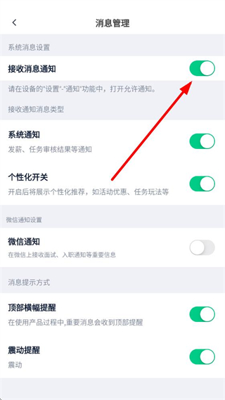 4、在消息管理頁(yè)面將接收消息通知功能的開關(guān)關(guān)閉,即可關(guān)閉消息通知。