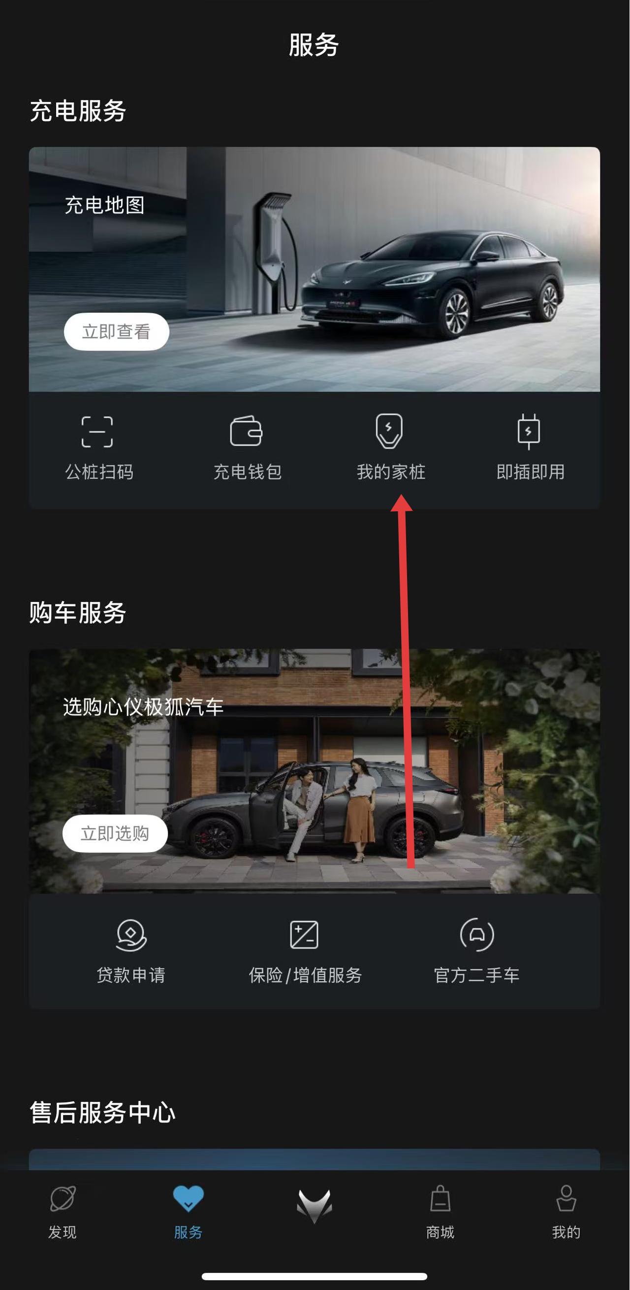 2、在服務(wù)頁面的充電服務(wù)板塊里,點(diǎn)擊我的家樁選項(xiàng)。