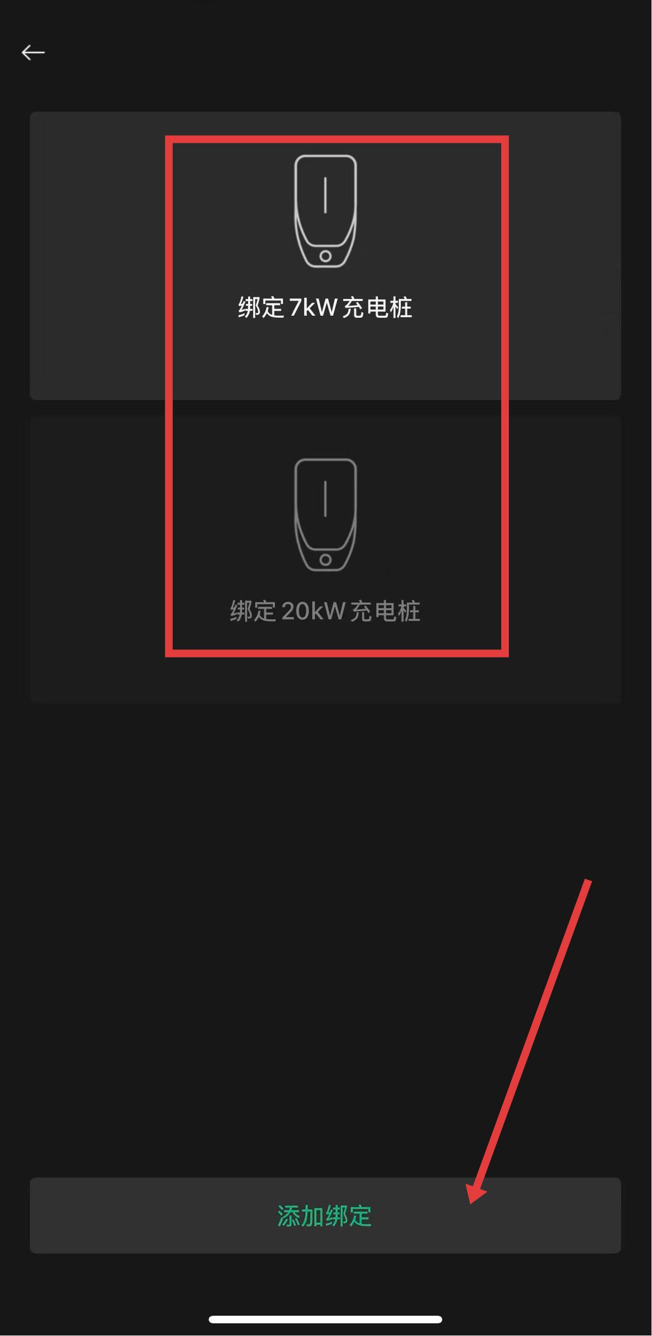 3、進(jìn)入綁定頁面后,選擇要綁定的充電樁類型,比如綁定7kW充電樁或綁定20kW充電樁,然后點(diǎn)擊下方添加綁定按鈕。