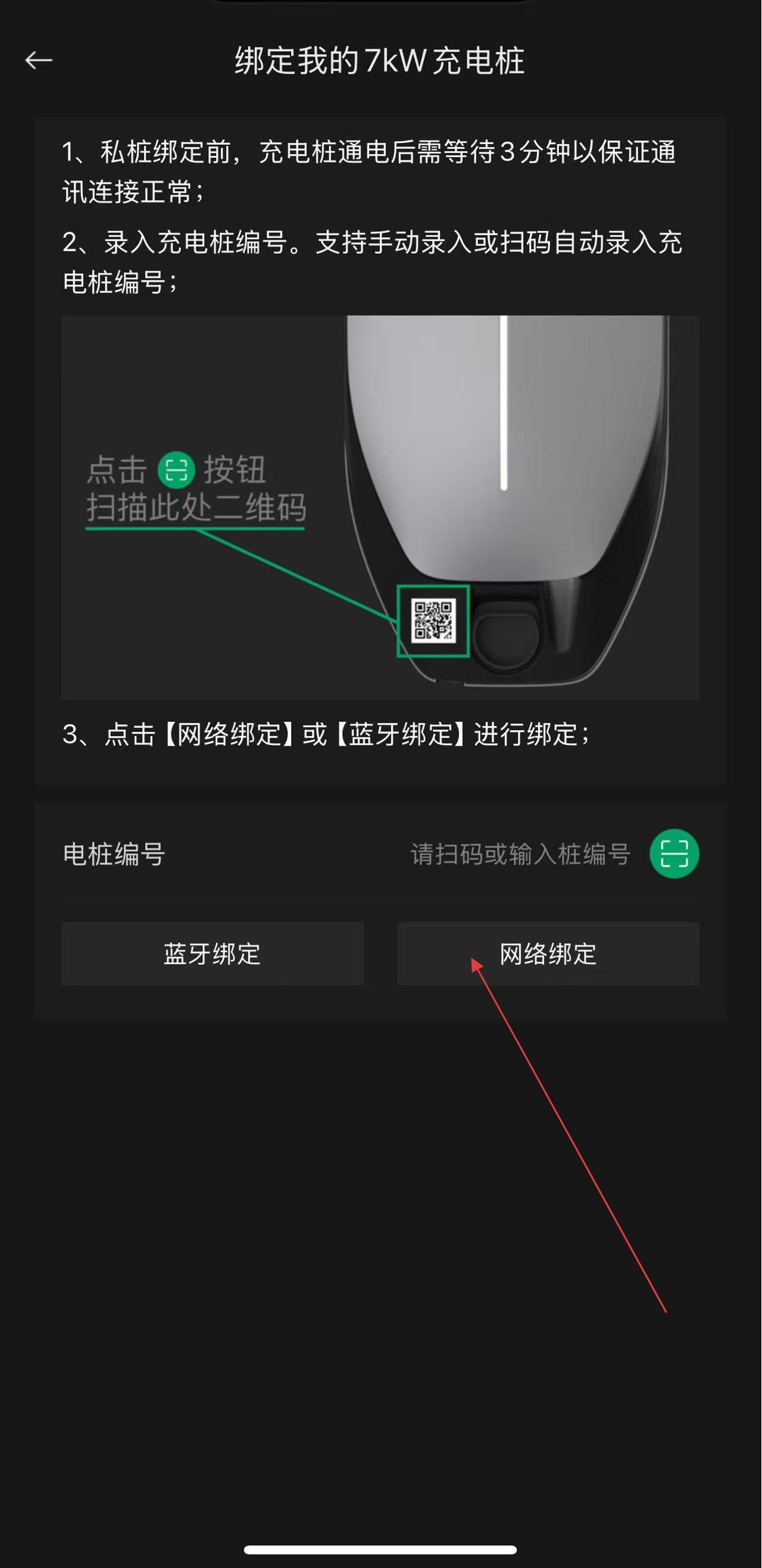 4、在綁定界面,先確保充電樁通電3分鐘以上,接著掃碼或手動(dòng)錄入充電樁編號(hào),最后點(diǎn)擊網(wǎng)絡(luò)綁定完成充電樁綁定操作。