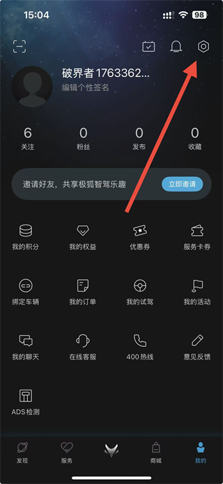 1、在ARCFOX極狐app界面,點(diǎn)擊右下角我的,進(jìn)入個(gè)人頁面。