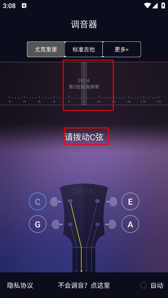 4、撥動(dòng)尤克里里的C弦,根據(jù)APP顯示的頻率等信息,調(diào)整弦的松緊,使音調(diào)符合標(biāo)準(zhǔn)。