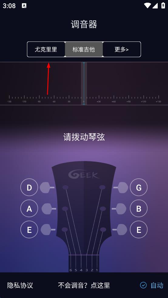 2、進(jìn)入調(diào)音器界面,點(diǎn)擊“尤克里里”選項(xiàng),切換到尤克里里調(diào)音模式。
