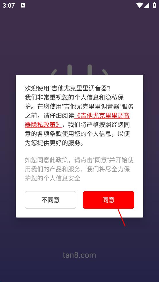 1、打開吉他尤克里里調(diào)音器APP,出現(xiàn)隱私政策提示頁面,仔細(xì)查看后點(diǎn)擊“同意”按鈕。