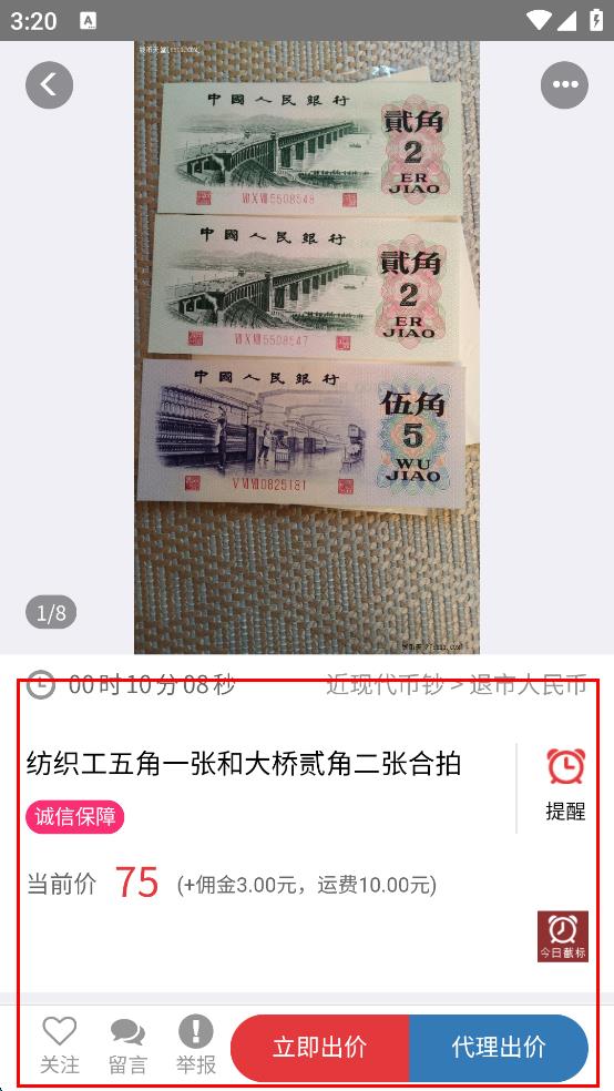 4、在錢幣詳情頁(yè)面,可查看錢幣的圖片、名稱、當(dāng)前價(jià)格、傭金、運(yùn)費(fèi)等詳細(xì)信息,還能進(jìn)行關(guān)注、留言、舉報(bào)、出價(jià)等操作。