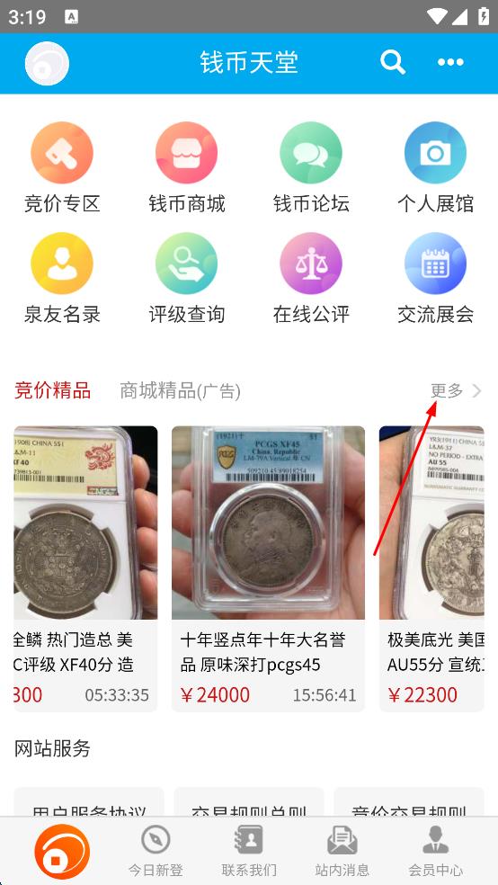 2、在應(yīng)用主界面,找到“競(jìng)價(jià)精品”區(qū)域右側(cè)的“更多”按鈕并點(diǎn)擊,進(jìn)入錢幣大廳頁(yè)面。