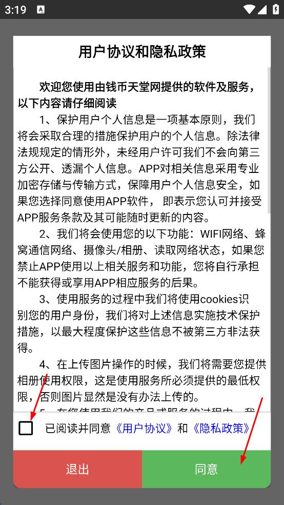 1、打開(kāi)錢幣天堂應(yīng)用,彈出用戶協(xié)議和隱私政策提示框,勾選已閱讀并同意用戶協(xié)議和隱私政策,點(diǎn)擊“同意”按鈕,進(jìn)入應(yīng)用主界面。