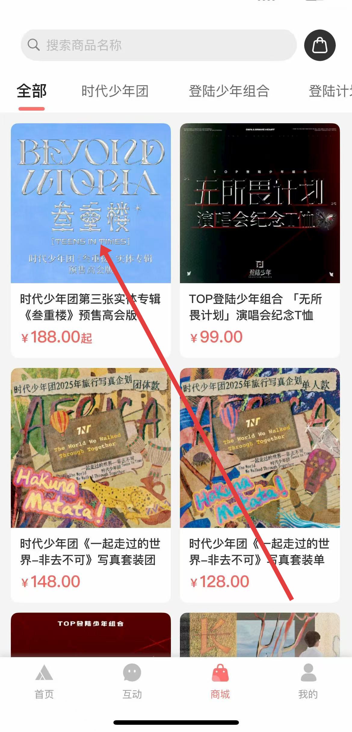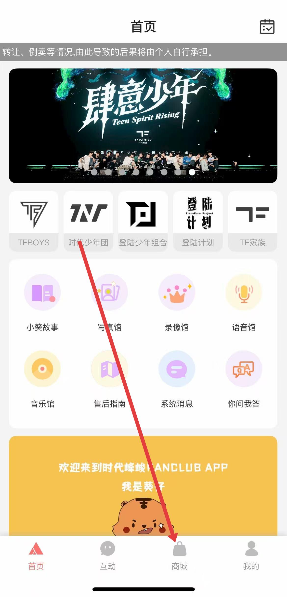 1、打開TF家族FANCLUBAPP,在首頁底部導航欄中找到商城選項,點擊進入。