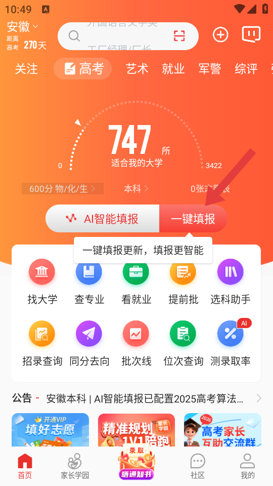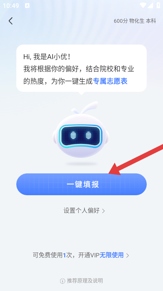 1、在優(yōu)志愿的首頁,點擊一鍵填報的按鈕,進(jìn)入AI志愿生成的界面。