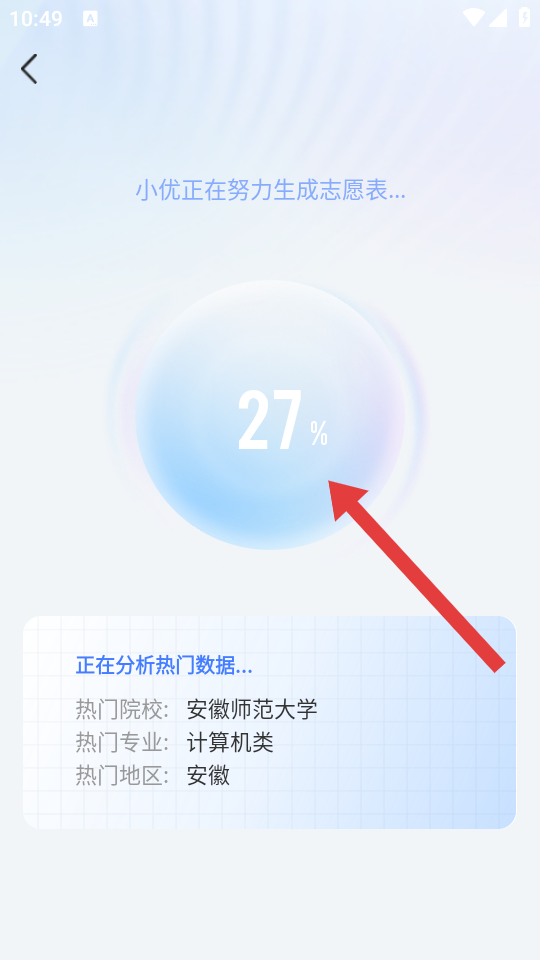 3、等待系統(tǒng)加載,頁面顯示小優(yōu)正在努力生成志愿表...及進(jìn)度,同時可查看熱門院校、專業(yè)等數(shù)據(jù)。