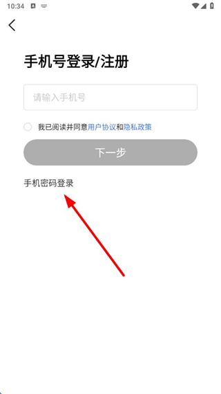 2、在手機(jī)號登錄注冊頁面,點擊手機(jī)密碼登錄選項。