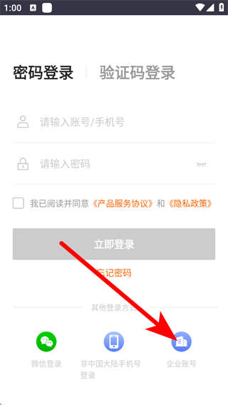 1、打開美團(tuán)管家APP,在登錄頁面點擊企業(yè)賬號,進(jìn)入企業(yè)賬號登錄頁面。