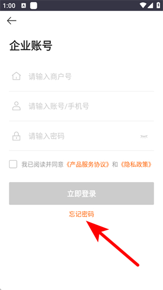 2、在企業(yè)賬號登錄頁面,點擊忘記密碼,進(jìn)入忘記密碼的頁面。