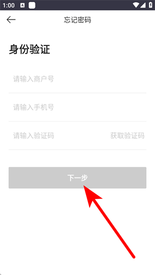 3、在頁面依次輸入商戶號信息后,點擊下一步,按照提示完成密碼找回操作。