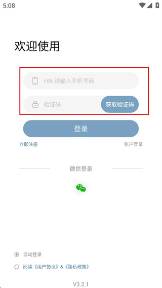 3、在登錄頁面輸入手機(jī)號(hào)碼和驗(yàn)證碼。