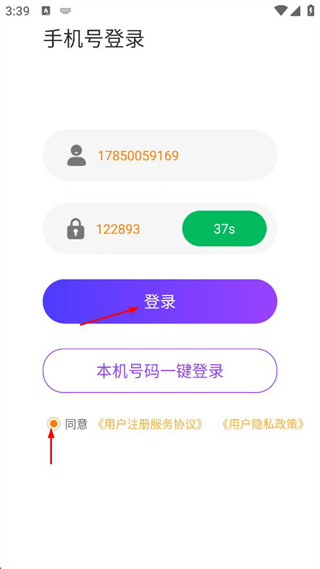 2、輸入驗(yàn)證碼,勾選同意用戶協(xié)議和隱私政策,點(diǎn)擊“登錄”按鈕。
