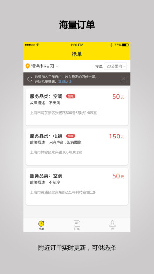 閃修一哥一哥版非常的實用的生活服務(wù)管理軟件,此版本為維修工人版通過平臺生成的訂單用戶通過手機接單,維修,統(tǒng)一的收費標(biāo)準(zhǔn)就看你自己是否接單非常的方便,有需要的用戶就來下載試試吧!