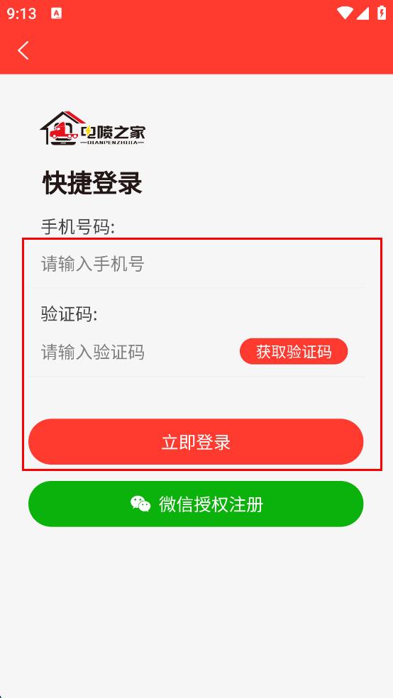 4、在快捷登錄頁面,輸入手機號碼,點擊獲取驗證碼,收到后輸入驗證碼,再點擊立即登錄按鈕。