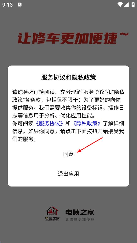 1、打開電噴之家軟件,會彈出服務(wù)協(xié)議和隱私政策提示框,仔細(xì)閱讀后,點擊同意按鈕。