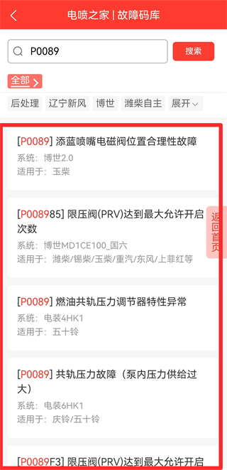 3、點擊搜索按鈕,即可查看該故障碼對應(yīng)的詳細(xì)解析列表。