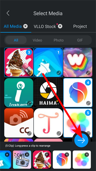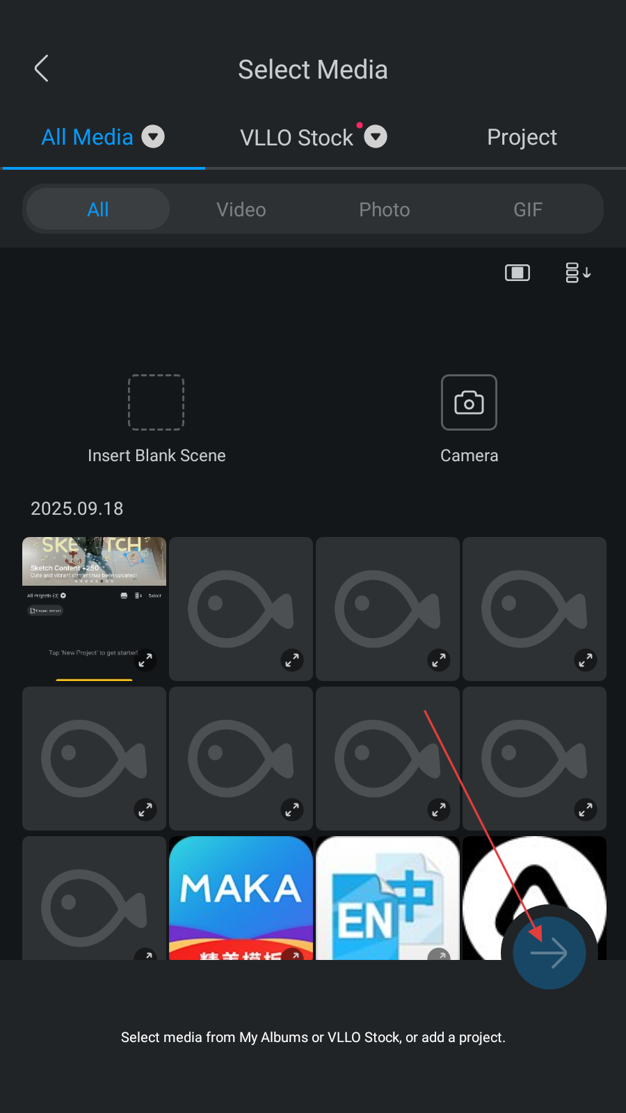 2.進(jìn)入選擇媒體界面,選擇需要編輯的視頻、照片或GIF素材,點(diǎn)擊右下角的箭頭按鈕。