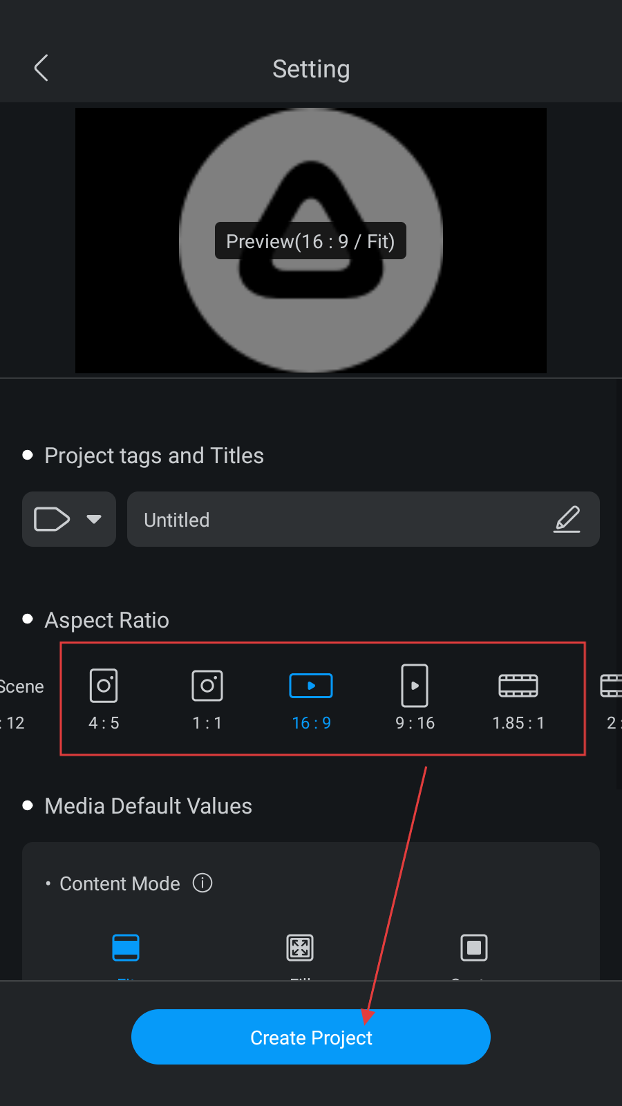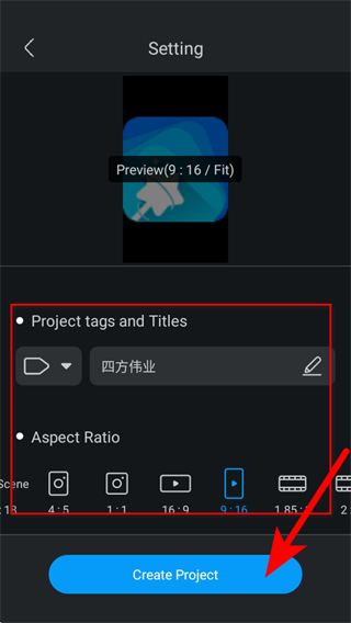 3.在設(shè)置界面中,可設(shè)置項(xiàng)目標(biāo)簽和標(biāo)題,選擇畫面比例如9:16,設(shè)置完成后點(diǎn)擊Create Project按鈕。