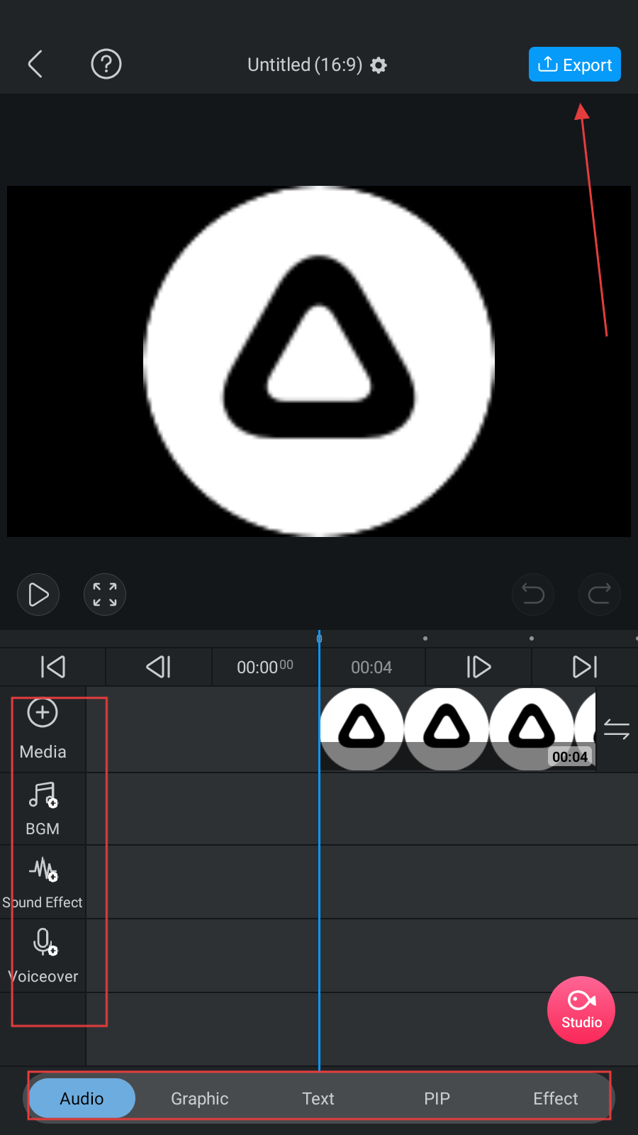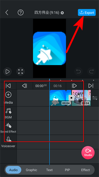 4.進(jìn)入編輯界面后,可在時(shí)間軸上對(duì)素材進(jìn)行剪輯、添加背景音樂、音效、畫外音等操作,編輯完成后點(diǎn)擊右上角的Export按鈕導(dǎo)出視頻。