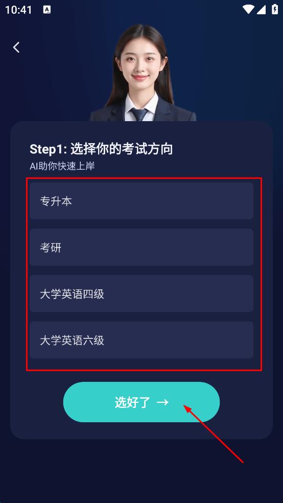 2、進(jìn)入選擇考試方向頁面,選擇要備考的考試方向,然后點(diǎn)擊“選好了”按鈕。