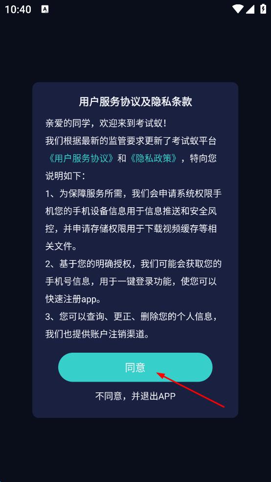 1、打開考試蟻APP,會(huì)彈出用戶服務(wù)協(xié)議及隱私條款提示框,點(diǎn)擊“同意”按鈕。