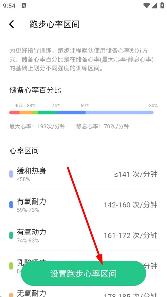 2、在跑步心率區(qū)間頁面,點擊下方設置跑步心率區(qū)間按鈕。