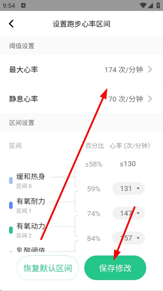 3、進入設置頁面后,可按需修改最大心率、靜息心率等數值,點擊保存修改,即可完成心率提醒設置。