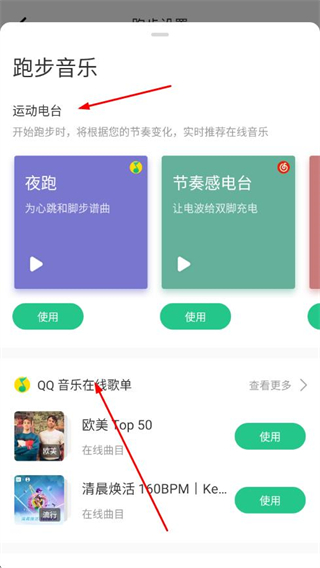 3、在跑步音樂頁面選擇喜歡的在線歌單,點擊使用,即可完成自選歌單設置。