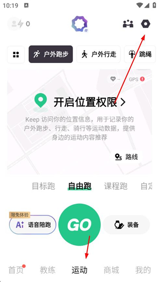 1、打開Keep APP,在運動頁面點擊右上角的設置圖標,進入跑步設置頁面。