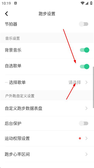 2、在跑步設置頁面找到自選歌單選項開啟,點擊選擇歌單。