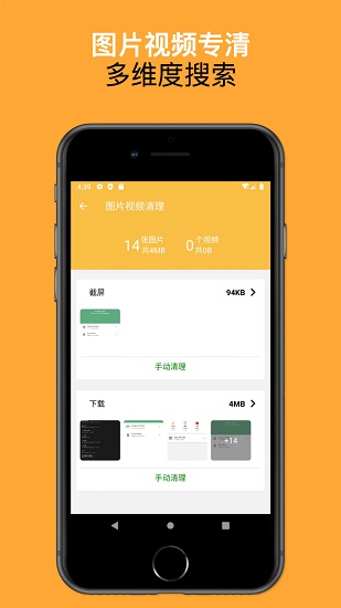 智能掃描、分類手機的緩存圖片,按照類別呈現(xiàn),幫助用戶更快的找到不需要的文件。