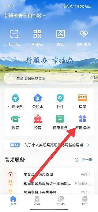 1、打開新疆維吾爾自治區(qū)政務服務APP首頁,點擊應用編輯選項,進入服務功能的管理界面,可調整常用服務布局。