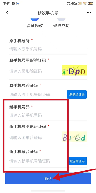 4、再輸入新手機號碼、圖形驗證碼,點擊發(fā)送驗證碼并輸入驗證碼,點擊確認按鈕,即可完成手機號變更操作。