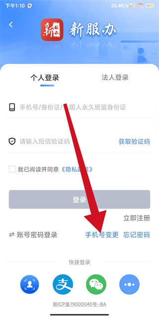 1、在新服辦app個人登錄頁面點擊手機號變更選項,進入方式選擇頁面。