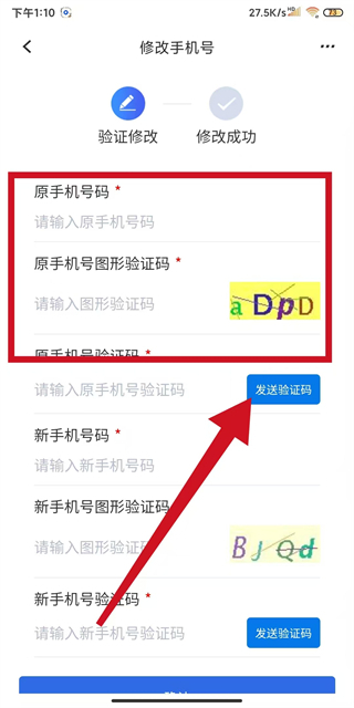 3、在修改手機號頁面輸入原手機號碼、圖形驗證碼,點擊發(fā)送驗證碼并輸入驗證碼。