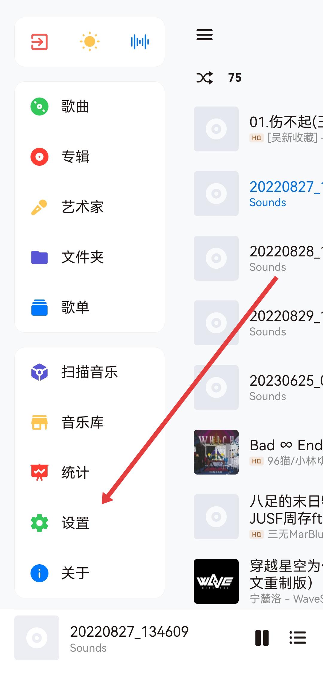 1、打開椒鹽音樂APP,點(diǎn)擊左上角菜單圖標(biāo),在展開的選項(xiàng)中找到并點(diǎn)擊設(shè)置,進(jìn)入設(shè)置的界面。