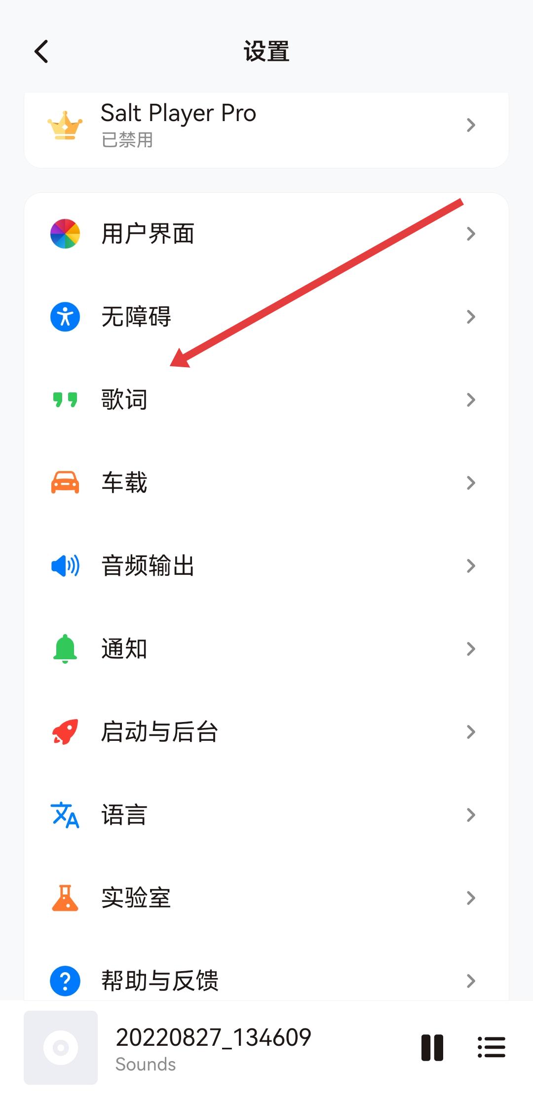 2、在設(shè)置的頁面中,需要點(diǎn)擊歌詞的選項(xiàng),進(jìn)入歌詞設(shè)置的界面。