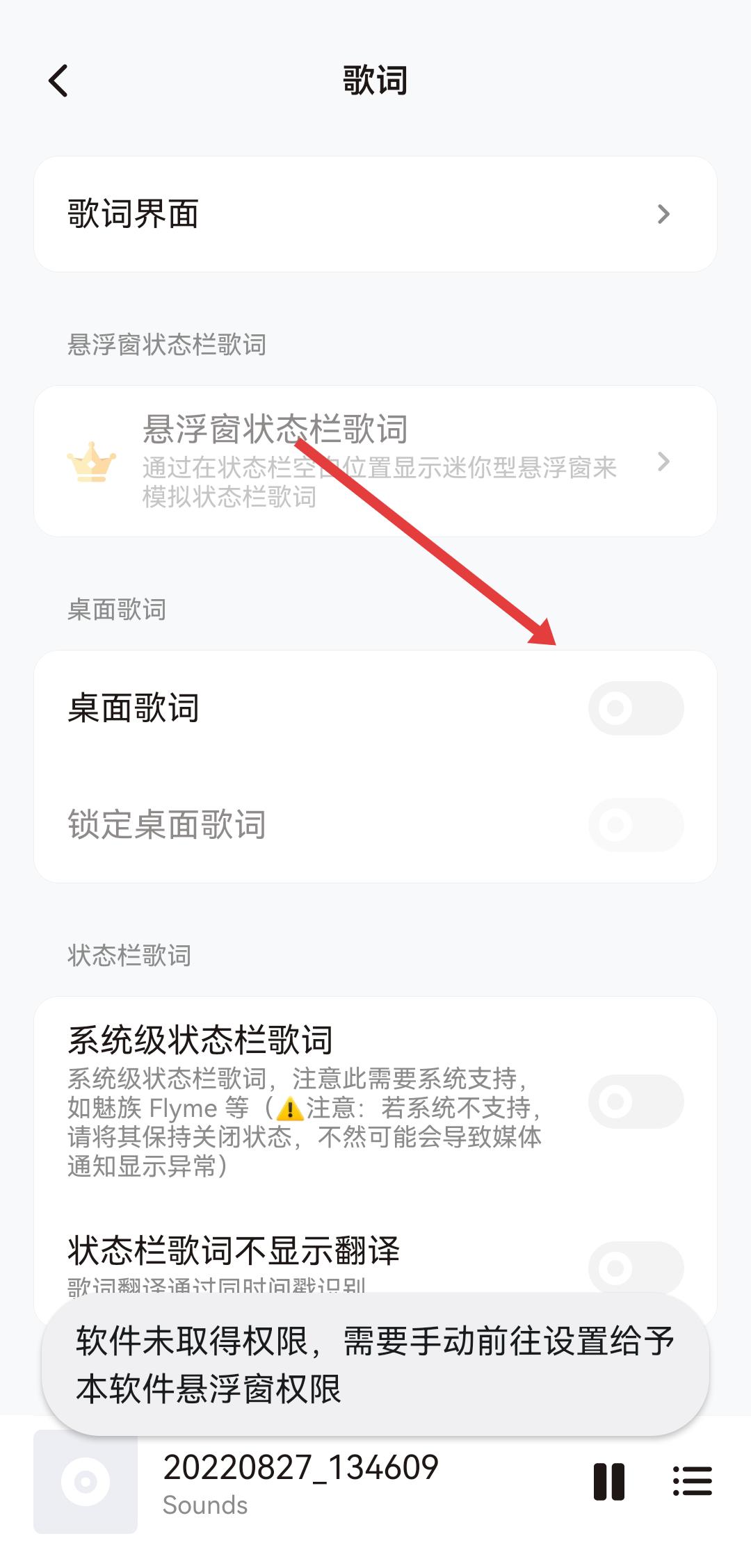 3、在歌詞設(shè)置界面,可以根據(jù)需求開啟桌面歌詞,也可以選擇開啟系統(tǒng)狀態(tài)欄歌詞。