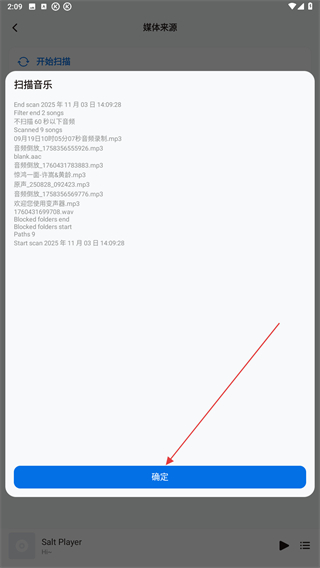 3、點(diǎn)擊后,界面會(huì)彈出掃描到的音樂,再次點(diǎn)擊確定即可完成。
